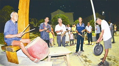 村鑼鼓隊在村公園涼亭里排練