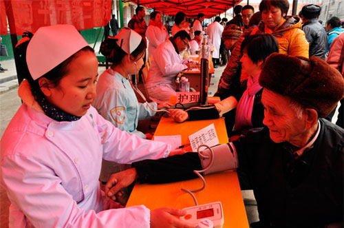 (書坊活動現(xiàn)場,醫(yī)生們免費為村民量血壓) ?