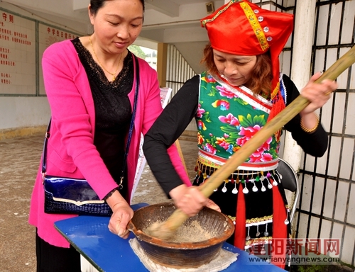 畬族山歌對(duì)唱(劉朝旭 李祥嬌) 4月9日,筆者走進(jìn)漳墩鎮(zhèn)的民族中學(xué),這里人聲鼎沸,熱鬧非凡,原來(lái)一年一度的畬族“三月三”烏飯節(jié)在這里舉行,周邊村莊的畬民和眾多游客都前來(lái)參加這個(gè)盛大的民俗文化節(jié)。 “三月三”烏飯節(jié)是畬族特有的傳統(tǒng)節(jié)日,是畬族群眾的一次家族大聚會(huì),這一天畬民家家都做烏米飯,全家共餐,饋贈(zèng)親友,同時(shí)還聚集一起唱歌、跳舞,以此來(lái)紀(jì)念這一節(jié)日。 在活動(dòng)現(xiàn)場(chǎng),畬民們穿著鮮艷亮麗的民族服飾為游客們制作擂茶:在擂缽內(nèi)加入大米、花生、芝麻等原料,用擂棍頻頻舂搗,用撈瓢過(guò)濾擂好的茶,加水沖煮,味道濃郁綿長(zhǎng)的擂茶就制作出來(lái)了。游客們一邊品嘗獨(dú)具特色的擂茶,一邊向畬民學(xué)習(xí)擂茶制作工藝,還有游客紛紛拍照留念。 “今天我和朋友們一起來(lái)這里玩,這里太棒了,可以親自體驗(yàn)畬族文化,感覺(jué)十分有趣”,40多歲的童女士興奮地說(shuō)道。 龍角巫舞、火把舞山歌對(duì)唱、四季梅花舞、扁擔(dān)舞等一系列的傳統(tǒng)的畬族歌舞表演在民族中學(xué)的禮堂內(nèi)上演著,充滿著濃濃畬族風(fēng)情讓觀眾不禁沉醉其中,大家不時(shí)驚嘆,鼓掌,為演出者熱情四溢的表演歡呼。 畬民在現(xiàn)場(chǎng)制作擂茶(鄧雪 攝) 今年漳墩“三月三”烏飯節(jié)不僅吸引了一大批游客前來(lái),建陽(yáng)當(dāng)?shù)氐臄z影愛(ài)好者、作家也慕名前來(lái)采風(fēng),感受豐富多彩的民俗文化。他們不時(shí)拿出相機(jī)記錄著畬族的特色食品、服飾、歌舞,保存這美好的時(shí)光。 在歌舞表演結(jié)束后,大家一起到學(xué)校的操場(chǎng)觀看畬族的射箭表演,民族中學(xué)的孩子們手持傳統(tǒng)弓箭,氣定神閑瞄準(zhǔn)靶心,在場(chǎng)上形成了一道讓人賞心悅目的風(fēng)景。 看完表演后,游客們的目光紛紛被一位可愛(ài)的畬族姑娘吸引了,只見(jiàn)她穿著紅色的畬族服,手里端著新鮮出鍋的烏米飯,色澤藍(lán)綠烏黑,并帶油光,讓人食欲大開(kāi)。畬民介紹道,烏米飯是將從山地里采來(lái)野生烏稔樹(shù)的嫩葉,置于石臼中搗爛后用布包好放入鍋中浸熬,然后撈出布包,將白花花的糯米倒入烏黑的湯汁里燒煮成了飯。烏米飯是具有民族特色的保健美食,在這里家家戶戶都會(huì)蒸煮。 品擂茶,看表演,吃烏飯,這些豐富多彩的民俗活動(dòng),展示獨(dú)特民族文化,今年漳墩的“三月三”,畬民的熱情好客、能歌善舞讓游客留下了深刻的印象,感受了畬鄉(xiāng)風(fēng)情。