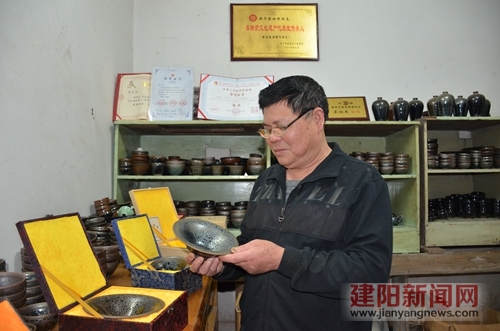 蔡炳昆和他燒制的油滴盞 “不風(fēng)不雨正晴和,翠竹亭亭好節(jié)柯。”4月19日,筆者走進位于塔山公園旁的“蔡氏建盞”工作室。工作室是一棟兩層的小樓,依偎在青山腳下。迎門的木架上擺滿淡黃色的建盞素坯,一個面容和藹、濃眉大眼的漢子,正把剛沾過釉水的建盞素坯瀝干,整齊地擺放在木架上,他專注靈巧,面帶微笑,仿佛這工作中有無限的樂趣,完全不像一個67歲的老人,他就是“建窯建盞制作技藝”代表性傳承人蔡炳昆。 1949年,蔡炳昆出生在南浦溪畔的水吉鎮(zhèn),村落不遠(yuǎn)處有一個地方叫“大路后門”,一條黑色龍窯匍匐于山脊,這就是中國宋代八大名窯之一建窯遺址所在地。建窯以燒造黑釉茶碗(俗稱“建盞”)著稱于世,與青瓷、白瓷三分天下,享譽海內(nèi)外。歷史上,建盞始燒制于五代末,兩宋時達到鼎盛,自元代初中期以后逐漸被歷史的塵土所湮沒,陷入沉寂近千年。 童年的蔡炳昆和小伙伴們上山砍柴,或在草叢里玩耍時,常常能撿到黑瓷片,仔細(xì)觀察,瓷片上的點點光芒含蓄而美麗,有股穿越時空的力量。聽著關(guān)于建盞的美麗傳說,年幼的蔡炳昆常幻想能工巧匠云集,龍窯噴火,建窯建盞源源不斷地運往全國各地的情景。 想象很豐滿,現(xiàn)實很骨感。蔡炳昆有兄妹7人,父親是個制陶師。由于父親身體不好,蔡炳昆13歲就正式跟父親學(xué)做陶器。挑土、煉泥、拉坯、上釉……做陶的活計樣樣都不輕松,可是懂事的蔡炳昆不用父親吩咐,樣樣活兒都搶著干。他最喜歡的是拉坯,坐在轉(zhuǎn)盤前,泥坯仿佛有了靈性,一番拉、捏、切,泥坯就變成了你想要的家什,特別有成就感。不到三個月,缽頭、花瓶、小壇,小蔡炳昆早已手到擒來。最難做的是大器型的酒壇,一個足有一米多高。剛開始,不是比例有問題,就是歪頭,癟肚,他不氣餒,一天下來,手皮磨破了,也不歇一歇。在父親的指導(dǎo)下,不久,他制作的大酒壇肚大口小,模樣周正,特別受顧客歡迎。16歲,制陶的的十八般武藝他已樣樣精通,他能和父親一樣拉著滿滿一手板車的陶器走上百里路程到麻沙去銷售,成了父親的左膀右臂。 19歲,蔡炳昆參軍入伍;23歲,蔡炳昆退伍,分配在建陽壓縮機廠,成了一名制模技術(shù)工。年輕的蔡炳昆身上透著一股靈氣,又特別愛琢磨,愛動手,不管什么模具他只要看一眼,量一量尺寸,就能做得像模像樣,不久就成了車間數(shù)一數(shù)二的制模能手。 建盞在沉寂800年后再次受到世人的矚目。1981年春,建陽瓷廠技術(shù)人員與中央工藝美術(shù)學(xué)院、省輕工研究所、省博物館等專家經(jīng)過上百次試驗終于燒制成功一批兔毫斑紋的仿古建盞。這一事件再次勾起蔡炳昆深埋心中的建盞夢,他開始搜集建盞制作方面的資料,利用業(yè)余時間向周圍制作建盞的人學(xué)習(xí)。1995年,他開始利用業(yè)余時間研發(fā)建盞。“那時,白天上班,制作建盞全靠晚上,一天只睡3、4個小時。”提起當(dāng)年的辛苦,蔡炳昆很是感慨。好在,原來做陶的手藝幫了他大忙,拉坯已是輕車熟路,釉水的配制也有共通之處,最難把握的是窯溫控制。建盞的黑釉屬于結(jié)晶釉的范疇,建盞的釉色斑紋是“天工”與“人巧”的高妙邂逅,窯溫的變化,使釉面產(chǎn)生奇特的花紋,溫度低,花紋出不來,溫度高則產(chǎn)生開裂、冒泡等現(xiàn)象,前功盡棄。然而,建盞“入窯一色,出窯萬彩”的獨特魅力深深地吸引著蔡炳昆,他燒制、記錄、總結(jié),十幾窯后他終于燒制出第一批兔毫盞,黑色的釉層中透露出均勻細(xì)密的脈絡(luò),如兔子身上的毫毛一樣纖細(xì)柔長,他覺得所有的辛苦都得到了回報。 2004年,55歲的蔡炳昆從工廠內(nèi)退,全身心投入到建盞的研發(fā)制作中。老蔡是個愛琢磨的人,用他妻子的話說就是“仿佛對泥巴著了魔。”不管是出門辦事還是走親訪友,看到有特色的泥巴,老蔡總要停下腳步,抓起一把捻一捻,看一看,滿意的還要帶一點回家燒制研究。不久,蔡炳昆就燒制出紅、藍油滴、曜變等,開發(fā)了梅瓶、花瓶、蓋碗、茶具等多種器型。 老蔡堅持采取傳統(tǒng)工藝制盞,制作的每件作品都打上“昆”字款。專家評價蔡炳昆的建盞不僅達到質(zhì)似,而且達到形似、神似的標(biāo)準(zhǔn),他的建盞作品遠(yuǎn)銷北京、天津、上海等大城市,大多做“回頭客的生意”。 2015年1月,蔡炳昆設(shè)計制作的《金油滴建盞》榮獲第三屆“中國·金藝獎”國際工藝美術(shù)創(chuàng)新設(shè)計大獎金獎;2015年10月,《束口銀油滴盞》獲海峽兩岸文化產(chǎn)業(yè)交易會“中華工藝優(yōu)秀作品評比銀獎”。(張敏英 丁曉雄) |