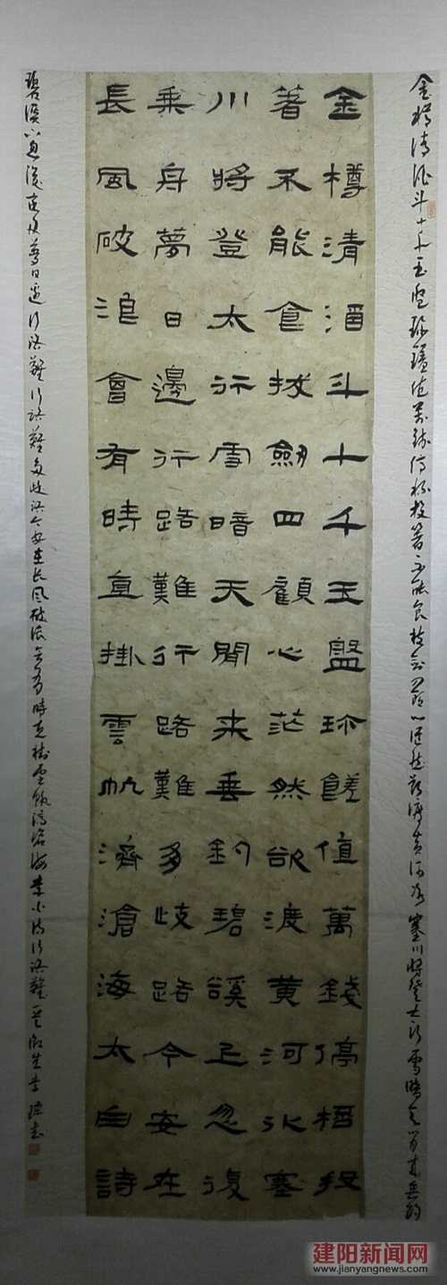 ??? 本報訊第三屆全國教師現(xiàn)場書畫創(chuàng)評暨教學(xué)論壇,于5月17日至20日在江蘇蘇州舉行。來自全國20多個省市,200多名教師參加了現(xiàn)場大賽。我區(qū)曼山小學(xué)教師李瑋一路過關(guān)斬將,最終獲得現(xiàn)場創(chuàng)評一等獎。 本屆大賽是由《中國書法報》報社主辦、《書法報o書畫教育》編輯部、蘇州市鑒藏家協(xié)會承辦。大賽分為初賽和現(xiàn)場大賽兩個環(huán)節(jié)。評委會以質(zhì)量為原則,在全國各地教師投稿的兩千幅書畫作品中,篩選了兩百余幅優(yōu)秀作品,邀請優(yōu)秀作品作者參加現(xiàn)場創(chuàng)評大賽。在初賽階段中,李瑋老師的作品經(jīng)評委會評定,質(zhì)量很高,取得參與現(xiàn)場創(chuàng)評的資格。5月18日,在現(xiàn)場創(chuàng)評大賽中,李瑋老師創(chuàng)作的書法作品被評為一等獎。 李瑋老師熱衷于書法藝術(shù),幾十年如一日研習(xí)書法,其作品章法嚴(yán)謹(jǐn),筆力遒勁,深受書法愛好者的喜愛。圖為李瑋初賽書法作品。 (張敏英) |