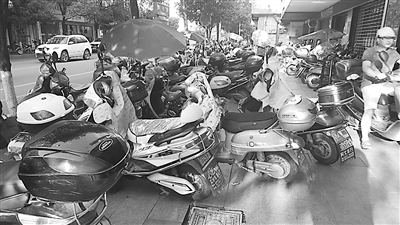 4日,記者在建陽(yáng)區(qū)人民路看到,人行道上橫七豎八停了大量摩托車、電動(dòng)車,行人不得不側(cè)身而過(guò)。 (朱宇 攝)