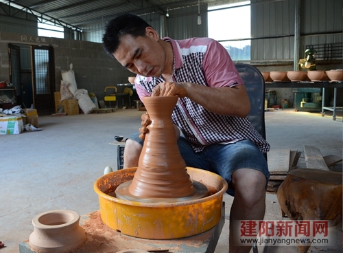吳周福在拉坯 ????三伏盛夏,在建陽塔山工業園區福佬建盞陶瓷廠里,一排窯爐正在燒制建盞,年過40的吳周福在給建盞窯爐添加油柴,窯爐室里的高溫炙烤難耐,汗珠掛在臉頰,其辛苦不言而喻。他笑著說,油柴添多少、什么時間添加很有講究,把握不好都會影響建盞成色。 緣起收藏樂于制盞 聞名海內的建盞產自建窯,“建窯”是我國著名的古窯之一,其遺址位于水吉鎮后井、池中村,它的制品在宋代已享有盛名,因宋時崇尚斗茶之風盛行,故除了必需提供優質的茶葉之外,還需要有最適于斗茶所用的茶具,建盞就是當時斗茶最佳的茶具。 1975年,吳周福出生在后井村,自幼受到建盞文化熏陶。1993年初中畢業的他回鄉務農,吳周福發現,有很多外地人來到自己家鄉舊窯址收購舊黑盞。有一次,看到有人在舊窯址上深深鞠躬,神色莊重虔誠,對古老的建盞殘片都愛不釋手。年青聰明的吳周福心想,這黑舊盞一定是好東西,要不怎么會有那么多人來到這窮鄉僻壤。也許是家鄉情緣,于是平日里就多留份心,關注以前不太注意的黑舊盞,慢慢地喜歡上黑盞,做起建盞收藏研究,并且興趣與日俱增,從了解到熱愛、癡迷。 2005年,賺了第一桶金的吳周福不滿足只收藏,他更想自己也能制作出建盞。多年從事建盞收藏研究的經歷,練就了他對建盞胎體、釉色、斑紋、器形有著獨到的理解。他租來場地,買來設備、原料,并到處參觀拜師學藝,試驗燒制建盞,失敗了,再試驗,再失敗,再接著干,如此反復,愈挫愈堅。吳周福坦言,燒制建盞要不怕失敗,每個做建盞成功人都是反復試驗摸索出來,唯有執著探索,才能獲得成功。2014年11月,他成功燒制出頂級的藍油滴和銀油滴,2015年11月,他的作品《藍油滴茶盞》榮獲中國(北京)國際創新產品交易會工藝美術華表獎金獎。 執著研試探秘曜變 曜變是建盞中可遇不可求的寶物,目前存世的三件曜變建盞,是南宋的傳世孤品,均收藏于日本,被譽為“碗中宇宙”,幾百年來,曜變盞一直被日本人奉為茶道的圣物,并被小心翼翼的保存下來。 吳周福說,曜變是建盞里最頂級的寶物,每個制盞人夢寐以求,幾年前的一次偶然機會,他發現自己燒制的大斑點油滴還有藍光圈,與曜變盞相似,于是就往這個方向嘗試著燒制仿曜變建盞。 “曜變”是指燒制成功的黑瓷器物能在光照之下,于器表薄膜上煥發出黃、藍、綠、紫等色彩融揉起的彩光。但要使得成品瓷器的表面上出現宛若天際彩虹一般的繽紛效果,必須在燒制過程中形成一種非常薄的鐵結晶膜。可惜南宋滅亡后,這種制瓷工藝就失傳了。 吳周福告訴筆者,在研制曜變過程中,每次機會都很偶然,有時獲得一點成功后,過了一段時間,燒制出的作品又達不到原有的水準,這時他就會反復想,到底是哪里出問題呢?窯爐氣溫、泥土、釉料配比、燒制方法等等。曜變真是可遇而不可求,講究的是緣分和運氣,但是要多做、多試、多燒,不怕失敗,不要氣餒,只要窯爐火不滅,就一定有成功的希望。 吳周福仿制的曜變建盞已有宋代曜變的韻味,在陽光的照射下,隱約能看到類似曜變建盞的藍色天空星光閃爍,在建盞行業獨樹一幟,深受業界人士和建盞收藏愛好者的認可喜愛。 吳周福常說,當下所有的制盞人都是為探索宋代建盞古老藝術,做盞人要匠人匠心,耐得住寂寞,勤煉內功,不攀比,不浮躁,在堅持中學習進步。 辛勤汗水贏得了成功。去年9月,吳周福的作品《束口曜變油滴盞》榮獲第九屆中國(合肥)國際文化博覽會暨中國工藝美術精品博覽會優秀作品金獎。為了標識自己的建盞作品,吳周福在自己的作品底部打上“福”或“福佬”字款,目前在天津、廣州、北京設有專賣店。 ???? (張貴興 丁曉雄) |