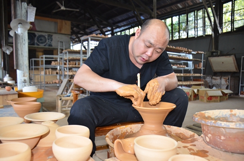 9月6日,南平市建陽區(qū)春盞建窯陶瓷開發(fā)有限公司建盞工藝師謝松青忙著將一批剛燒制的油滴盞檢驗裝盒,準備發(fā)貨,銷往外地。 二十年矢志建盞收藏 謝松青,建窯建盞協(xié)會鑒定咨詢委員會委員、建盞鑒定師,南平市建陽建窯建盞協(xié)會副會長、南平市工藝美術(shù)協(xié)會副會長。對建盞情有獨鐘、幾近癡迷的謝松青,出生于建陽水吉鎮(zhèn)后井村,這里就曾是宋代出產(chǎn)黑釉建盞的寶地。謝松青告訴筆者:“從小在山上、田里、路邊,都會看到大量散發(fā)出晶瑩光彩的黑碗殘片。以前家中盛茶、裝鹽、盛飯、喝酒的盞都是宋代建盞。所以,特喜歡家鄉(xiāng)的建窯建盞。” 稍長成人,謝松青就著手收藏建盞。20年一晃過去,這位有心人收藏的建盞琳瑯滿目,數(shù)量驚人。十年前,當建陽建設大潭古街,他就在此開了一間名曰“大宋御琖”的店面。 走進店里,只見櫥窗展柜擺滿了各式各樣的建盞。當?shù)亟ūK專家謝道華表示:“謝松青是大潭古街和建盞收藏界公認的建盞種類非常齊全的收藏家,無論是器型、類別、大小都基本囊括。特別是除了建盞,他還收藏了宋代與建盞有關(guān)的各類器具、茶缽、茶盞、茶漏、茶托、茶臼、茶杵、茶碾等‘斗茶’器具,為了解宋代茶文化提供了有力的佐證。” 如今,他收藏到最有價值的建盞,就是盞底銘有“供御”、“進琖”字樣的建盞。大大小小口徑的竟有20余件,其中口徑最大的為21厘米兔毫盞,這是迄今國內(nèi)收藏界已知發(fā)現(xiàn)銘有“供御”款里口徑最大的宋代建盞。 談起收藏的感受時,謝松青告訴筆者:“我最大的愿望就是希望在建窯所在地興建一座大型建盞博物館,將各位收藏家收集到的建盞集中起來,展示給世人!” 十五載傾心建盞傳承 從建盞收藏家變?yōu)闊平ūK傳承人,這是謝松青對來自家鄉(xiāng)建盞癡迷所激發(fā)出來的動力。他認為:宋代建盞斷燒八百余年,畢竟存世數(shù)量有限。要傳承、恢復、光耀黑釉建盞的魅力,光顧收藏還不夠,必須盡己之所能,創(chuàng)燒出一批能與宋代建盞比美的仿古建盞。于是,從2000年起,謝松青開始建窯燒制。他從姑丈提供的建盞燒制秘方反復實驗、不斷實踐,終于摸索出多種制釉的配方。 十多年里,不論酷熱難耐,還是寒冬刺骨,謝松青都刻苦鉆研,僅兩年功夫,揉泥、拉坯、修坯、上釉、控溫等近20道工序,他都能領(lǐng)悟、操作,并逐漸得心應手。在不斷的燒制試驗摸索中,他力求做到仿古產(chǎn)品保持宋代風格古樸典雅的造型,并以宋代建盞老盞的胎反復試驗,直至熟練掌握老胎復燒的關(guān)鍵技術(shù)。他成功燒制出仿宋代建盞的珍珠斑、鐵銹斑等宋代特色的建窯建盞,以自己收藏的宋代建窯特別的器型按一比一比例生產(chǎn)出建窯特色器型產(chǎn)品。近年來,為滿足現(xiàn)代茶友的欣賞和審美要求,他又成功燒制出大斑紋銀、藍油滴,造型古樸多姿、端莊典雅的建盞產(chǎn)品深受茶友們的喜愛。 2015年,謝松青成立建陽區(qū)春盞建窯陶瓷開發(fā)有限公司,公司集建盞陶瓷研究、開發(fā)、生產(chǎn)、銷售于一體。目前,已新開發(fā)出建盞標準盞、茶盞、茶具系列等產(chǎn)品。所仿制的油滴和兔毫產(chǎn)品與宋盞相比,不僅達到形似、而且達到質(zhì)似、神似。2015年,他的建盞工作室第一批榮獲“建陽建盞”地理商標準用權(quán)。2016年,“春盞建窯建盞”被評為南平市工藝美術(shù)行業(yè)推薦品牌。2016年2月,大連理工學院學子慕名到春盞建窯陶瓷開發(fā)有限公司參觀交流學習建盞文化。2016年7月4日—9日,應日本國際貿(mào)促會邀請,由福建省商務廳組織的春盞建窯、憬峰建盞等6家建陽建盞企業(yè)在日本東京國際禮品展上大放異彩。為提高自己燒制建盞的理論水平,從日本參展回來,他又主動參加了省文化廳主辦的“中國非物質(zhì)文化遺產(chǎn)‘建窯建盞’傳承人研修班”。 自2012年起,謝松青的作品多次在全國工藝品展銷會上摘金奪銀,先后斬獲金、銀、銅獎達三十余項,作品被南平市博物館收藏。2015年11月,春盞建窯陶瓷開發(fā)有限公司被省僑聯(lián)授予僑聯(lián)服務聯(lián)系點,謝松青的缽形油滴盞作品由區(qū)僑聯(lián)贈予馬來西亞檳城建陽公會。2016年3月,謝松青的油滴盞作品作為禮品,由中國旗袍協(xié)會贈予南非總統(tǒng)和夫人。此外,他的撇口油滴盞作品還被日本國際貿(mào)易促進協(xié)會永久收藏,南平電視臺、福建海峽衛(wèi)視等多家媒體播放了他的作品及其創(chuàng)業(yè)的成功事跡。 (李加林)