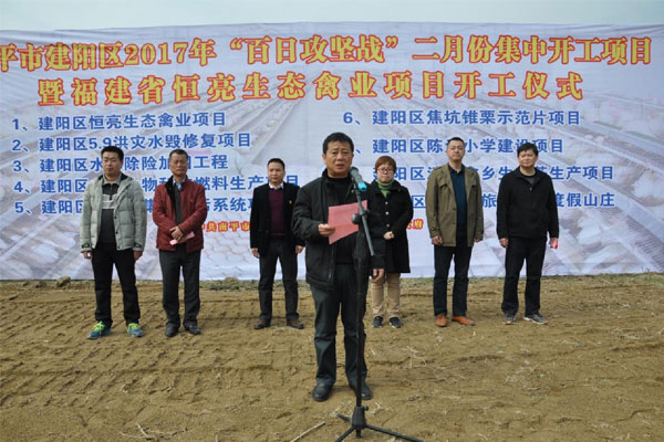 在全市上下擼起袖子,撲下身子大干100天,掀起百日攻堅項目建設新熱潮之際。28日上午,回龍鄉隆重舉行南平市建陽區2017年“百日攻堅戰”二月份集中開工項目暨福建省恒亮生態禽業項目開工儀式,區委孫德勝常委、區政府陳文藩副區長、南平督導組成員、回龍鄉黨政班子成員以及沿途群眾代表參加了儀式,動工儀式由陳文藩副區長主持。 據悉,恒亮生態禽業蛋雞養殖項目,落戶回龍鄉滸洲村狀元坊,項目占地296畝,總投資2.2億元,該項目有四個特點:一是體量大。計劃存欄蛋雞150萬羽,將建設成為全省最大的蛋雞養殖基地和雞蛋生產基地;二是技術新。項目采取“全進全出、封閉管理、預防為主、治療為輔”的標準化模式,全程智能化控制、無公害生產;三是質量高。蛋雞養殖不用藥、不打抗生素,雞蛋質量達到歐盟和日本出口標準;四是后續多。恒亮生態禽業計劃將整合現有養殖基地,成立集體公司煜江南,將總部搬到建陽。 儀式最后區委孫德勝常委宣布項目開工。(高壟) |