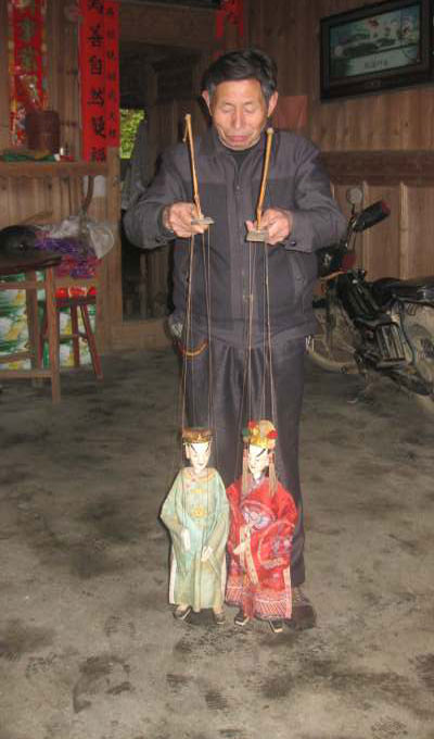 (鄧土旺演示提線木偶的操控) 木偶戲是由藝人操縱木偶表演故事的戲劇。木偶俗稱“傀儡”,木偶戲也稱“傀儡戲”,曾是偏僻山區群眾文化生活中唯一的亮點。上世紀90年代隨著電視的普及和人們精神生活的豐富,逐漸淡出人們的視野。然而,在閩北大山里的建陽區漳墩鎮碓后村這個畬族聚居地卻活躍著一支別具特色的提線木偶民間表演班。 表演班子由四人組成,都是漳墩本地農民,其中一人在后頭敲鑼打鼓,二人拉二胡、吹嗩吶,領頭的提線木偶藝人為漳墩鎮碓后村的鄧土旺老先生。老先生作為木偶操縱表演者,雙手可同時操縱4個偶人,一邊操縱一邊演說劇本。每年漳墩鎮當地及周邊的建甌、松溪、順昌、政和等縣市各處的廟會總是提前預約,請他們前去演出助興,成為閩北一支十分活躍的提線木偶演出班。 3月12日,筆者走進漳墩鎮碓后村財洋橋自然村鄧土旺老人的家。65歲的的鄧土旺老先生頭發花白、精神矍鑠,剛從建甌的小松鎮演出回來,正在房間為木偶道具做養護。床上、凳子上花花綠綠的木偶色彩艷麗,惟妙惟肖。老先生告訴我們,現在看木偶劇的人少了,但每次演出仍有不少老年觀眾捧場。現在最常表演的有《薛仁貴征東》等48個劇目,擔心表演劇本失傳,從上世紀八十年代初,鄧老先生開始手抄劇本,歷時16年,輯錄96本。老先生小心翼翼地捧起一個武官偶人告訴我們,這些木偶道具從雕刻成型到表情刻畫、服裝鞋帽的制作都由他親手完成。人偶道具共有48個,角色分為王侯將相、文臣武官、布衣鴻儒、士農工商等,收拾好剛好一挑,俗稱“傀儡擔”。 據了解,漳墩的提線木偶大概在清代時由南來北往的商人傳入。曾經是十里八鄉臨近縣市不多的娛樂形式之一,紅極一時。鄧土旺從小酷愛木偶劇,只要聽說有木偶表演,再遠也要趕去看上一場。他十三歲開始自學木偶劇演出必備的二胡、京胡、嗩吶等樂器的演奏技巧。27歲正式拜隔壁周家村的木偶藝人涂仁貴為師,學習木偶劇表演。由于天資聰穎,又刻苦好學,僅學一年時間,就能操控木偶上臺表演。兩年后,鄧土旺自制木偶道具,獨立組班,出門表演。七、八十年代是木偶劇發展的黃金期,常常是農歷12月出門表演,第二年二月份才歸家。 在老先生家的客廳里,老先生邊為我們表演木偶劇《狄青被擄》隨著樂器聲響起,偶人自左向右出場,邊出場老先生邊唱劇本,通過提線控制,偶人便跑、跳、轉、翻、舞活靈活現。老人天賦“鐵嗓”久唱不敗。生、旦、凈、末、丑五種嗓音全會。長期在閩北各地演出,老先生還能熟練應用閩北各地方言表演,對白夸張幽默,很受群眾歡迎,如今,一年仍有十幾場演出, “隨著年歲的增大,我最擔心閩北的木偶表演會在我手里失傳。”老先生這樣告訴我們。由于提線木偶現在主要在廟會活動時演出,演出時長短則一天,長則三天,晝夜表演,是一項兼體力與腦力的活動,十分辛苦,且整個演出班一天的酬勞在六七百元之間,收入低,表演班子不穩定,無法吸引現在的年輕人學習,面臨著失傳的風險。(張敏英 錢建)