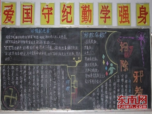 各班級開展“崇尚科學,反對邪教”主題黑板報制作比賽,普及學生反邪教知識,增強識別和抵制邪教的能力。