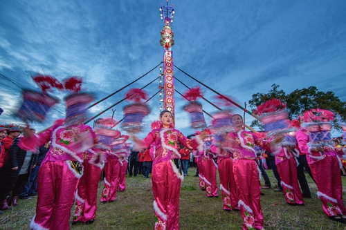 吉燈高照。(陳琦輝 攝) 童游彭墩村的倪王高照燈,是一種“高照”紙燈,堪稱建陽(yáng)花燈之王。“高照”,取吉星高照之意,這種巨型紙燈,由12組燈箱和3組旋轉(zhuǎn)頂燈銜接而成,主體制作材料為毛竹,形體似塔,高達(dá)13米,重200公斤, 豎燈表演時(shí)須20多人同步操作,場(chǎng)面蔚為壯觀。