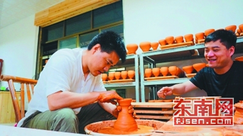 吳繼興、吳繼旺兩兄弟在一起創(chuàng)作。 許杰正接過父親手中的柴火,準(zhǔn)備給龍窯添柴。 東南網(wǎng)5月24日訊(福建日?qǐng)?bào)記者 趙錦飛 通訊員 周心婷 王柳珍 文/圖)提起建盞,腦海里總會(huì)浮現(xiàn)出黃美金、許家有和蔡炳盛等老藝人的形象。燒制建盞,如此古老、神秘,似乎與年輕人沒多大關(guān)系。 然而,這個(gè)古老的行業(yè)如今正煥發(fā)新的生機(jī)。在中國(guó)建窯建盞之都——建陽,有這樣一批“盞二代”,在其父輩的影響下,他們箕引裘隨,且青出于藍(lán)而勝于藍(lán),正逐漸成長(zhǎng)為行業(yè)中堅(jiān)力量。本期《助創(chuàng)》關(guān)注“盞二代”們用青春演繹的傳承與創(chuàng)新故事。 懷揣技藝,點(diǎn)亮傳承之火 37歲的黃文勇出生于陶瓷世家,少年時(shí)期,他跟著父親黃美金學(xué)陶藝。19歲時(shí),他已能獨(dú)立完成全套拉坯、上釉等制作工藝。2008年,為傳承建窯建盞技藝,在父親的帶領(lǐng)下,他花費(fèi)了近兩年的時(shí)間在水吉窯址研究建盞、龍窯的燒制技術(shù)。通過對(duì)古瓷片的研究,經(jīng)過上千次的燒成試驗(yàn),黃文勇獨(dú)立開發(fā)出兔毫、銀油滴等產(chǎn)品。 作為南平市非物質(zhì)文化遺產(chǎn)建窯建盞燒制技藝代表性傳承人之一,他說:“非遺傳承的并不只是過去的歷史,而是延續(xù)至今的文化積淀,作為新一代傳承人,讓建盞重放光彩,責(zé)無旁貸。” 燒制出精美的建盞,不僅需要成熟的燒制技藝,更需要的是耐心。曾經(jīng),黃文勇整整一年都沒能燒制出一個(gè)令自己滿意的作品。據(jù)他回憶,那一年清理的燒盞殘余垃圾,裝滿了百余個(gè)大編織袋,保險(xiǎn)柜里用于記錄失敗的筆記本有厚厚六十余本。雖然研制過程問題重重,但他毫不氣餒,只為忠于自己內(nèi)心的那一份堅(jiān)守。 毅然決然地守護(hù)著這方泥土,為建盞傳承事業(yè)發(fā)光發(fā)熱的不只是黃文勇。 在水吉鎮(zhèn)的蔡氏建盞研究所里,出生于1984年和1986年的蔡威、蔡杰兩兄弟,從孩童時(shí)期就常看見父親蔡炳盛坐在拉坯機(jī)旁扶泥拉坯,燒制建盞。兄弟倆閑時(shí)常幫著父親洗洗泥巴,打打下手。久而久之,逐漸對(duì)建盞萌生了濃厚的興趣。完成大學(xué)學(xué)業(yè)后,蔡威和蔡杰毅然回鄉(xiāng)“拜父為師”,并暗自下定決心要將這老一輩的手藝傳承下去,發(fā)揚(yáng)光大。 十年寒來暑往,在父親的言傳身教下,蔡家兩兄弟掌握了燒盞的全套工序。兩兄弟都獲評(píng)了“南平市中級(jí)陶瓷工藝美術(shù)師”職稱,在全國(guó)各大博覽會(huì)作品評(píng)比中屢獲佳譽(yù)。有了兩兄弟的幫助,蔡氏研究所的建盞銷量節(jié)節(jié)走高,年產(chǎn)量增加了70%。每談及兄弟倆,蔡炳盛總是露出欣慰的笑容:“我現(xiàn)在可以當(dāng)‘甩手掌柜’了,建盞燒制也后繼有人了。” |