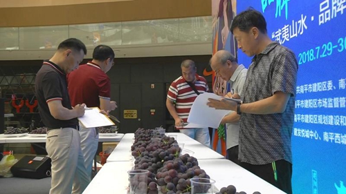 專家給葡萄評(píng)分 黃家馨/攝 為加快我區(qū)葡萄產(chǎn)業(yè)發(fā)展,規(guī)范推廣使用葡萄標(biāo)準(zhǔn)化栽培技術(shù),全面提升全區(qū)葡萄果品質(zhì)量,提高巨峰鮮食葡萄市場(chǎng)競(jìng)爭(zhēng)力,拓展葡萄營(yíng)銷市場(chǎng),我區(qū)結(jié)合“武夷山水·品牌建陽(yáng)”主題活動(dòng)于7月30日舉辦第一屆葡萄擂臺(tái)賽。 本次擂臺(tái)賽共收到巨峰葡萄果樣23個(gè)。擂臺(tái)賽堅(jiān)持公平、公正的原則,實(shí)行暗碼評(píng)比。福建省農(nóng)科院、南平市農(nóng)業(yè)局、南平市農(nóng)業(yè)科學(xué)研究所等多位專家對(duì)果品外形、內(nèi)質(zhì)、可溶性固形物等多方面綜合考量評(píng)分,共評(píng)出金獎(jiǎng)2個(gè),銀獎(jiǎng)4個(gè),優(yōu)質(zhì)獎(jiǎng)17個(gè)。經(jīng)過評(píng)選,建陽(yáng)區(qū)楠木林葡萄專業(yè)合作社的艾寶旺及南平市建陽(yáng)區(qū)山溪葡萄專業(yè)合作社的傅秋華獲得了此次擂臺(tái)賽金獎(jiǎng)。(方旭) |