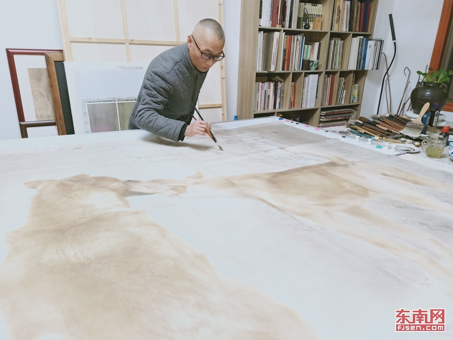 范欽旺正在進行巨幅工筆畫創作 黃杰敏/攝