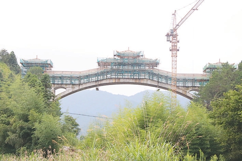 施工中的石圳灣跨山廊橋 15日,筆者乘車進入政和縣石圳灣美麗鄉村的旅游公路,遠遠就看見一座宏偉的跨山廊橋橫臥在石圳桐嶺峽上方。工人正在抓緊施工,以迎接政和縣第四屆中華紫薇文化節和南平市第三屆旅發會召開。 據介紹,跨山廊橋長90米,距離河面垂直高度50米,總投資1500萬元。目前已完成下部鋼筋混凝土主體結構,8月份將開始廊屋頂和木制細部結構施工,預計9月底完工。該橋設計造型曲線柔美,外觀大氣,視野開闊,同時融入朱子文化元素。建成后,將成為政和縣地標性建筑之一,進一步提升石圳鄉村旅游吸引力和中國白茶小鎮的知名度和影響力。(宋李珍 文/攝) |