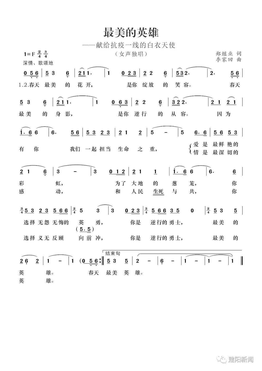 福建省音樂家協會副主席 南平市音樂家協會主席 建陽區政協副主席 李家回 為奮戰在抗疫第一線的醫務工作者們 創作了一首《最美的英雄》 春天最美的花開 是你綻放的笑容 春天最美的身影 是你逆行的從容 因為有你 我們一起擔當生命之重 愛是最鮮艷的彩虹 為了大地的蔥蘢 你選擇無怨無悔的英勇 你是逆行的勇士 最美的英雄 情是最深切的感動 和人民生死與共 你選擇義無反顧向前沖 你是逆行的勇士 最美的英雄 春天 最美英雄