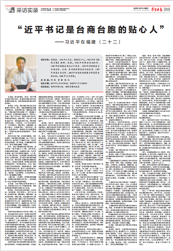 采訪對象:梁茂淦,1943年6月生,福建長汀人。1965年任《福建日報》編輯、記者。1984年任項南同志秘書,1988年任福建省委辦公廳處長,1990年任福建省臺辦副主任、主任,其間曾任陳丕顯同志秘書,1997年任省臺辦主任,2003年任省政協港澳臺僑委員會副主任。2008年12月退休。 采 訪 組:邱 然 黃 珊 陳 思 采訪日期:2017年6月9日初訪,2020年1月8日核訪 采訪地點:福州市芳沁園,福州西湖大酒店 采訪組:梁茂淦同志,您好!習近平同志任廈門副市長時,您是時任福建省委書記項南同志的秘書。請您談談他給您最初留下的印象。 梁茂淦:好的。我和習近平同志初次見面是在1985年。那天,我陪同項南同志到廈門處理公務,辦完事情以后,項南同志對我說:“你跟習近平同志聯系一下,問他晚上有沒有空,有空的話就讓他過來,我想見一見他。”晚上7點15分,我在住處的一層大廳等候習近平同志。他很守時,幾乎分秒不差地走進大廳,我老遠就看見了他。當時他給我的印象是,人很年輕,三十歲出頭的樣子,身材很魁梧,雄姿英發,步履穩健。我迎上前去,與他握手說:“近平同志,您好!我是梁秘書,項南同志在房間里等您。”習近平同志親切地向我問好:“梁秘書,你好!” 兩位領導見了面,相互親切問候,就開始談話,我就回自己的房間,趕一個第二天用的材料。他們談了大概兩個小時,習近平同志走的時候,我不知道,在房間里埋頭寫材料,他專門到我房間打了招呼。 后來,我在與項南同志談天的時候,他對我說:“近平真是個人才啊,后生可畏。你別看他年紀輕輕,但閱歷很豐富,很有工作經驗。他十幾歲就到陜北插隊,入了黨,當了大隊支部書記,在陜北那個艱苦的環境里當了七年的農民,后來被鄉親們推薦到清華大學上學,畢業后當了國防部長耿飚同志的秘書。之后他主動請纓,到河北正定縣艱苦的基層工作,當縣委副書記、書記。他在正定縣工作非常出色,表現非常突出,得到了組織的高度認可,前不久調到福建來。近平的為人處事很像他的父親習仲勛!很正直,很厚道,又很有理想,有堅定的信念。將來一定是前途無量啊。” 一面之緣,一次握手,簡單而親切的問候,項南同志娓娓道來的介紹……這就是我第一次認識習近平同志的情況。 采訪組:習近平同志非常重視對臺工作,而您在省臺辦工作了不短的時間,請您講講他是如何指導開展對臺工作的。 梁茂淦:習近平同志很有思想、很有內涵、很有原則,善于團結人,善于與人共事。他視野開闊、思想解放、思維敏捷,遇事冷靜沉著,經驗豐富。在敏感的對臺關系中,有他這樣德才兼備又敢于擔當的領導,是福建對臺工作之幸,也是我的榮幸。在他的直接領導和支持下,福建的對臺工作不僅沒有出任何問題,而且還屢創佳績,各項工作走在各省市的前列,年年受到中央臺辦表彰。 習近平同志重視對臺工作是一貫的。比如,他任福州市委書記時,親自擔任福州市委對臺工作領導小組組長。那時候他的工作有很多創新,比如“特事特辦”“馬上就辦,真抓實干”。他在福州創辦了全省首個“臺商臺胞接待日”,每個季度由市委書記和分管領導親自接待臺商臺胞。這項工作很受臺商臺胞的歡迎。每當接待日來臨,他們就早早地排隊等候,由習近平同志和相關領導親自出面接待。接待日的工作很有力度,凡是能立即解決的,則馬上就辦;如涉及面較大,需要有關部門協調的,都記錄在案,盡快落實,做到件件抓落實,件件有回音。這件事在臺商臺胞中產生了廣泛的良好影響。 習近平同志平時還經常到臺商臺胞當中進行調查研究,幫助他們排憂解難,給他們創造良好的投資環境。許多臺商臺胞與習近平同志結下了深厚友誼,稱贊道:“近平書記是我們臺商臺胞的貼心人。”2002年,習近平同志從福建調到浙江工作時,許多臺商臺胞都依依不舍,有的還專程到杭州去看望他。臺商們非常珍視與習近平同志的友誼,如冠捷電子、東南汽車、福聯紡織等臺資企業負責人把他們與習近平同志的合影珍藏至今。 采訪組:習近平同志在省委省政府工作期間,抓的工作更全面了,請您講講這一時期他的對臺工作有哪些創新舉措和積極成果? 梁茂淦:1996年,習近平同志任福建省委副書記時,兼任省委對臺工作領導小組常務副組長。他把在福州市工作時大量行之有效的對臺工作經驗帶到了省里,并結合全省情況采取了許多創新舉措。 第一,習近平同志大力支持臺辦的工作。他說:“省臺辦有什么實際困難,你盡管跟我說,我能解決的,盡量幫助你解決。”在他的支持下,省委省政府連續5年為省臺辦增加編制和經費。我們的三通處就是在他手上創立起來的。 第二,習近平同志帶領全省各級各部門認真學習貫徹黨的各項對臺方針政策,發揮福建的獨特優勢,創造性地開展各項對臺工作。他指出,福建最大的優勢是對臺,最敏感的也是對臺,只要各級各部門認真貫徹“和平統一、一國兩制”對臺基本方針和各項對臺方針政策,就能化敏感為有利,創造出奇跡。在他的直接領導下,各級各部門積極而有創造性地開展各項對臺工作,使福建省的對臺工作走在各省市前列,為推動兩岸發展作出了突出貢獻。 第三,習近平同志對建立健全對臺工作制度付出了很多心血。俗話說,沒有規矩,不成方圓。習近平同志擔任省委對臺工作領導小組常務副組長后,要求省臺辦和有關部門把省委省政府過去對臺工作的文件和政策進行綜合梳理,過時