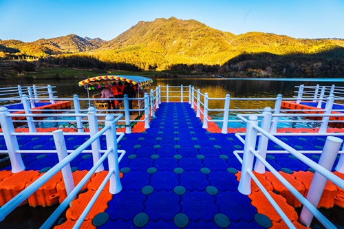 響古水世界碼頭余落日 繆德海 攝 夏末秋初,雨后,晴空。 晴嵐湖的水很清,晴好的日子,兩岸綠竹倒映其中,藍天白云襯于其底,游魚與鳥影共戲枝頭。 這時的晴嵐湖仿佛在靜靜的等待--等你來,船才開。 泛舟湖上,湖面更加遼闊、平展,微波蕩起一湖的柔情,將小船和湖邊的景色盡攬她的懷抱。 船行小湖上,人在云霧中,感受著美好的時光:碧水綠灘,千山翠竹,這分明就是我們苦苦尋找的世外桃源。 在這里,你可以枕水而眠--枕著翡翠般的水入睡,你的夢一定也是綠色的,說不定還有花瓣飄來。 湖面像隔了層模糊的水氣,氤氳彌漫的濕度就在你的眼前,在鉛色沉重的云朵上,陽光兀自穿越了天空悠長的曲譜,把光一點點揉進湖水。