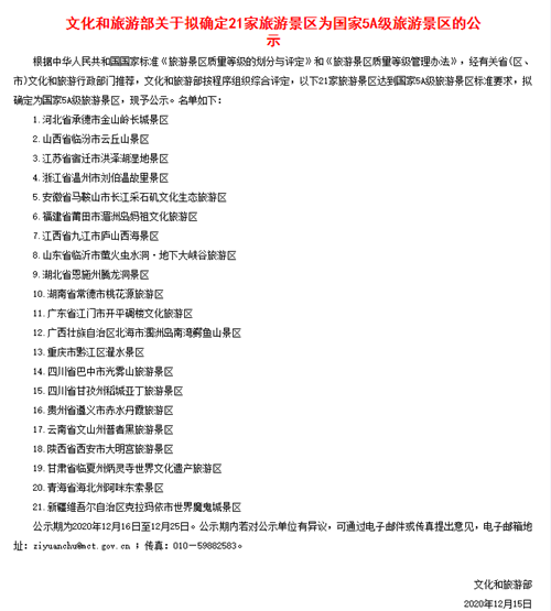 東南網12月17日訊(福建日報·新福建客戶端記者 儲白珊)12月16日,文化和旅游部發布公示,擬確定21家旅游景區為國家5A級旅游景區。我省莆田市湄洲島媽祖文化旅游區榜上有名。