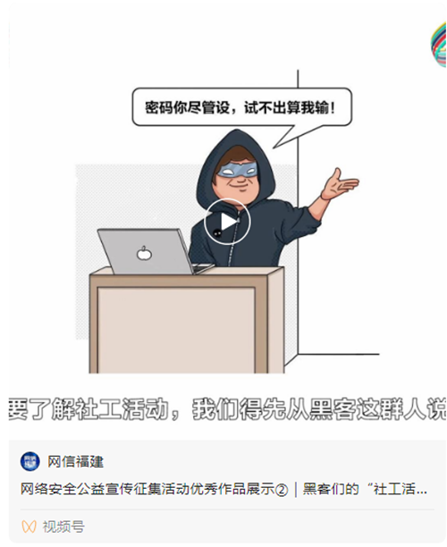 網(wǎng)絡(luò)安全公益宣傳征集活動(dòng) 優(yōu)秀作品展示 02 黑客們的“社工活動(dòng)”到底是干啥? 由省委網(wǎng)信辦主辦,華為福建分公司承辦的2021網(wǎng)絡(luò)安全宣傳周主題宣傳公益廣告征集活動(dòng),自2021年9月1日開始面向社會(huì)征集,共收到來稿100多件。經(jīng)過認(rèn)真評選,11件作品入圍,分別獲得一、二、三等獎(jiǎng)和優(yōu)秀獎(jiǎng)。 作品主要形式有短視頻、PPT海報(bào)、動(dòng)漫、H5等,內(nèi)容豐富,生動(dòng)活潑,可愛的卡通形象寓教于樂,生動(dòng)闡釋了網(wǎng)絡(luò)安全在我們生活中的重要性,對于向社會(huì)各界加強(qiáng)網(wǎng)絡(luò)安全教育,提高網(wǎng)絡(luò)安全防范意識(shí),具有積極的現(xiàn)實(shí)和實(shí)用意義。 |