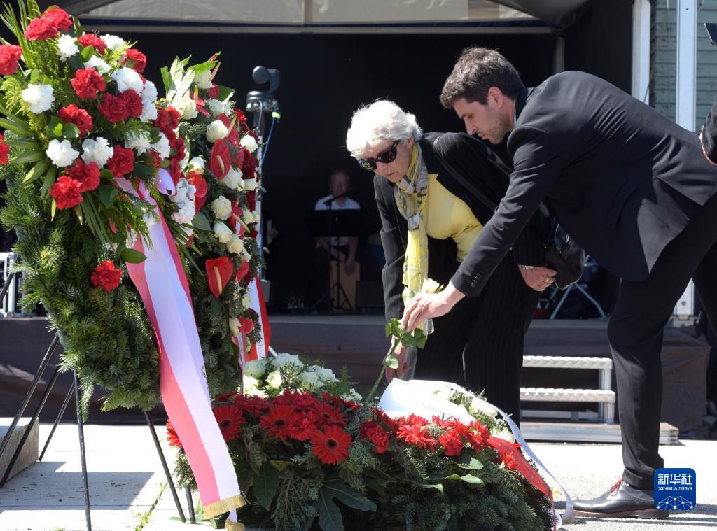 5月15日,人們在奧地利毛特豪森集中營紀念館向集中營遇難者獻花。新華社記者郭晨攝 中國駐奧地利大使館公使銜參贊楊文旭代表中國大使館參加活動,分別向紀念館中心廣場祭壇、遇難中國同胞紀念牌和蘇聯紅軍紀念碑敬獻花圈。