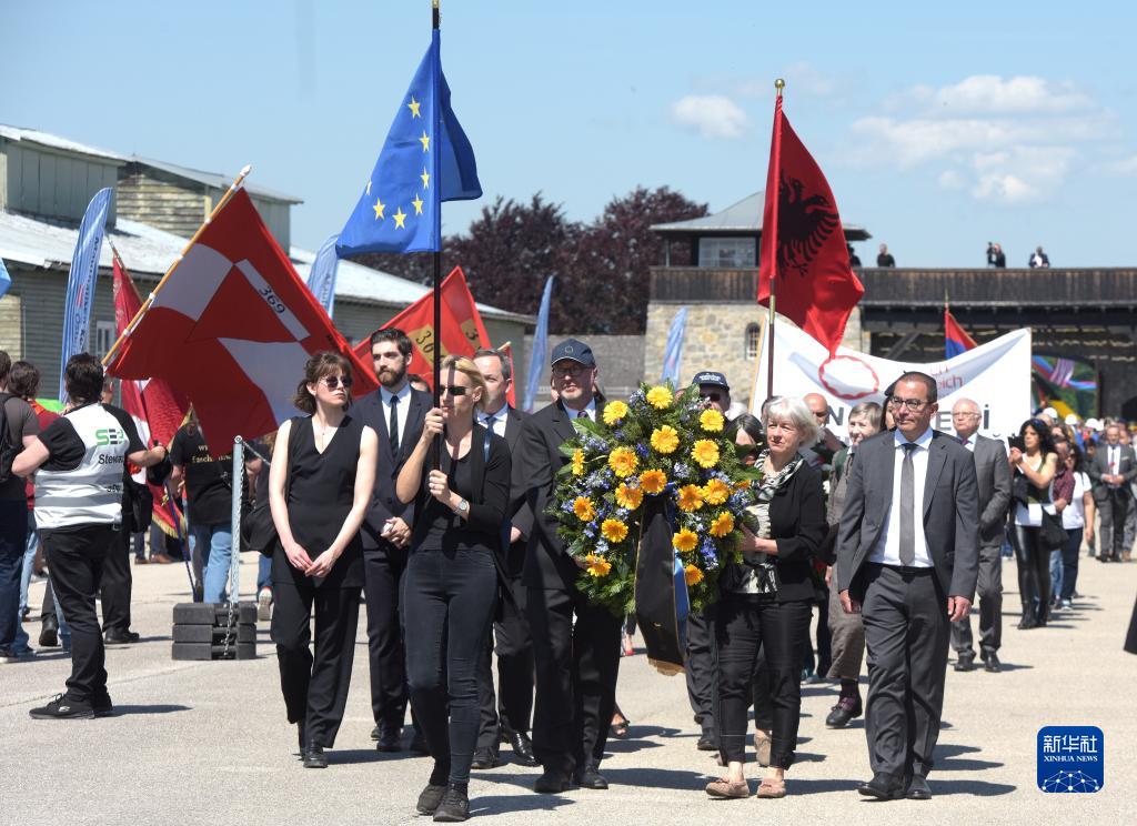 5月15日,人們在奧地利毛特豪森集中營紀念館參加集中營解放77周年紀念活動。新華社記者郭晨攝 楊文旭表示,中國使館祭奠在此遇難的受害者,深切緬懷死難中國同胞,再次表達中方關于銘記歷史、維護二戰勝利成果和正確二戰史觀、維護世界和平安全與國際公平正義,以及推動人類發展進步、推動構建人類命運共同體的堅定立場。