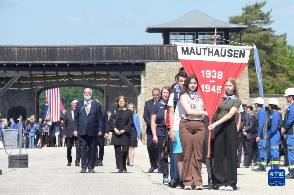5月15日,人們在奧地利毛特豪森集中營紀念館參加集中營解放77周年紀念活動。新華社記者郭晨攝 紀念活動當天上午在毛特豪森集中營舊址舉行,奧地利政要、多國駐奧使團、非政府組織代表等各界人士5000余人參加活動。
