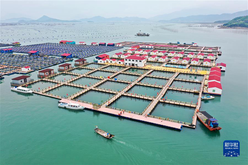 漁船經過福建省寧德市霞浦縣溪南鎮七星海域轉型升級的深水網箱養殖區(2021年7月1日攝,無人機照片)。新華社記者 姜克紅 攝 藍天碧海,微風拂浪。走進寧德霞浦縣溪南鎮七星海域,連片的新型塑膠漁排穩如陸地,一座座紅頂白墻的海上民宿格外醒目。 寧德三都澳海域資源豐富,但曾經海上養殖無證、無序、無度問題突出,海洋污染嚴重。近年來,當地全面開展海上綜合整治,推進漁業產業和海洋生態協調發展。環境變好了,海上觀光、垂釣平臺等旅游精品項目接連落地,漁業產業鏈條不斷延長。