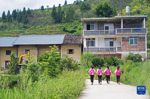 在江西省贛州市崇義縣上堡鄉上堡村,孩子們走在放學回家的路上(2020年9月10日攝)。遠處是一戶村民的土坯房祖屋和新建的三層小樓。新華社記者 萬象 攝