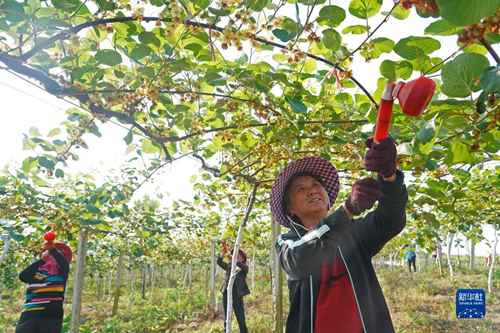 在位于江西宜春市奉新縣赤岸鎮城下村的“初心園”獼猴桃產業扶貧基地,村民為獼猴桃果樹進行人工授粉(2020年4月29日攝)。新華社記者 萬象 攝 |