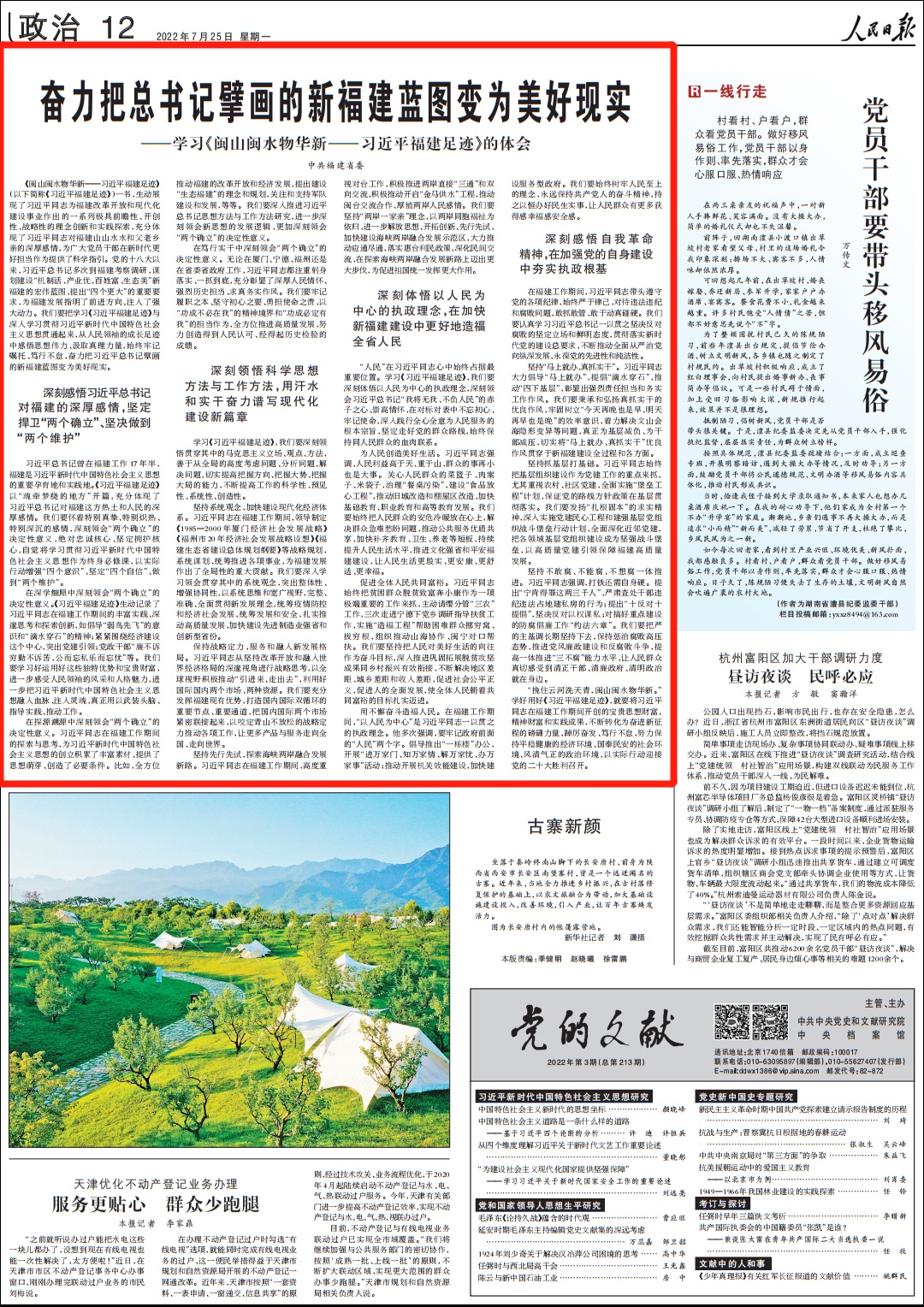 7月25日,《人民日報》刊發由中共福建省委撰寫的《奮力把總書記擘畫的新福建藍圖變為美好現實——學習<閩山閩水物華新——習近平福建足跡>的體會》,文章指出,《閩山閩水物華新——習近平福建足跡》一書,生動展現了習近平同志為福建改革開放和現代化建設事業作出的一系列極具前瞻性、開創性、戰略性的理念創新和實踐探索,充分體現了習近平同志對福建山山水水和父老鄉親的深厚感情,為廣大黨員干部在新時代更好擔當作為提供了科學指引。我們要把學習《習近平福建足跡》與深入學習貫徹習近平新時代中國特色社會主義思想貫通起來,從人民領袖的成長足跡中感悟思想偉力、汲取真理力量,始終牢記囑托、篤行不怠,奮力把習近平總書記擘畫的新福建藍圖變為美好現實。