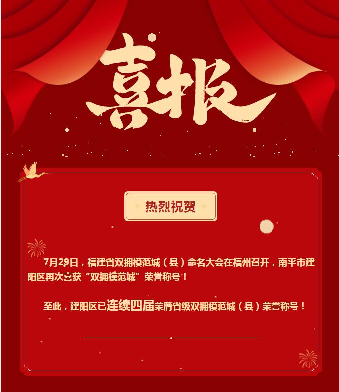 建陽區連續四屆榮膺省級雙擁模范城(縣)榮譽稱號