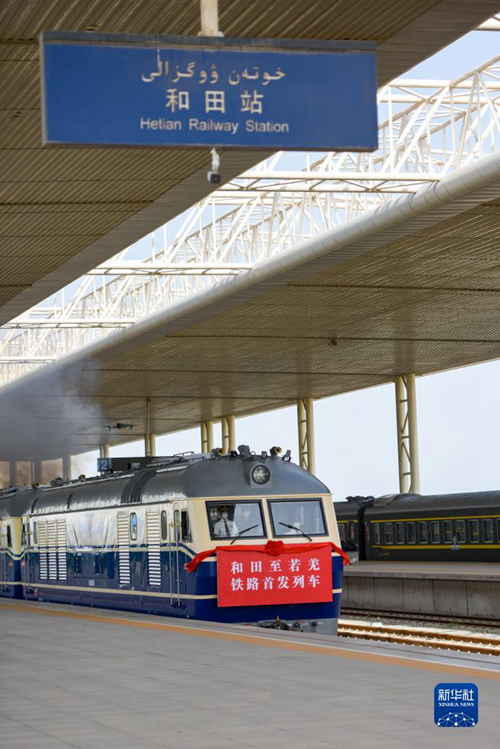 和田至若羌鐵路首趟列車駛出新疆和田火車站(2022年6月16日攝)。新華社記者 丁磊 攝 脫貧攻堅(jiān)號(hào)角吹響后,新疆各族干部群眾萬(wàn)眾一心、鼓足干勁,如期打贏脫貧攻堅(jiān)戰(zhàn),300余萬(wàn)農(nóng)村貧困人口全部脫貧、35個(gè)貧困縣全部摘帽,絕對(duì)貧困問題得到歷史性解決。 經(jīng)濟(jì)發(fā)展讓百姓的獲得感不斷增強(qiáng)。10年前,阿勒泰地區(qū)哈巴河縣居民胡瓦提·艾提汗還是一名自主就業(yè)的青年,收入一直不穩(wěn)定。如今在家鄉(xiāng)發(fā)展鄉(xiāng)村旅游,辦起農(nóng)家樂,年純收入達(dá)15萬(wàn)元。