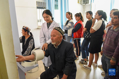 在新疆和田市伊里其鄉(xiāng)中心衛(wèi)生院,居民接受免費(fèi)健康體檢(2019年8月23日攝)。新華社記者 丁磊 攝 新疆堅(jiān)持把本級(jí)財(cái)政支出70%以上用于保障改善民生,教育、住房、醫(yī)療等方面不斷取得新進(jìn)展。10年來,新疆全面建成覆蓋全學(xué)段學(xué)生資助政策體系,沒有因貧失學(xué)輟學(xué)的孩子,城鄉(xiāng)義務(wù)教育一體化發(fā)展邁上新臺(tái)階。農(nóng)村安居工程持續(xù)推進(jìn),新疆徹底結(jié)束了農(nóng)村貧困人口住危房的歷史,近500萬(wàn)農(nóng)牧民住進(jìn)安居房。“醫(yī)療惠民”政策落到實(shí)處,2016年起新疆每年堅(jiān)持開展全民免費(fèi)健康體檢工作,建起了慢性病、傳染病、地方病的防線,構(gòu)筑起“健康新疆”的基石。
