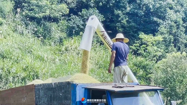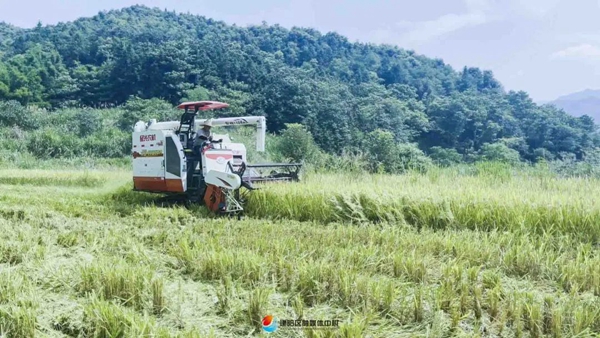 近日,在回龍鄉(xiāng)滸洲村,一臺(tái)臺(tái)收割機(jī)正在稻田里收割再生稻,處處洋溢著豐收的喜悅。