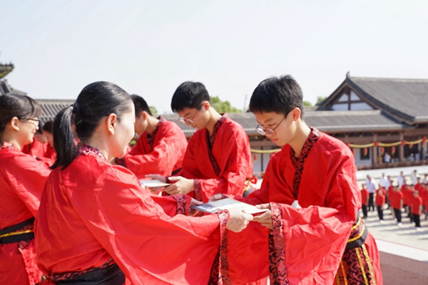 朱子敬師禮活動在莊嚴的國歌聲中拉開序幕,區長王沖在活動上致辭。他說,學習建陽先賢們“尊其師、重其道”之前跡,更是重在大力弘揚尊師重教的優良傳統,教育引領廣大學生常懷感恩之心,弘揚尊師持敬之精神,營造尊師重教的社會風尚。希望廣大老師不忘初心、牢記使命,爭做黨和人民滿意的有理想信念、有道德情操、有扎實學識、有仁愛之心的“四有”好教師,培根鑄魂育新人。希望同學們傳承道統、立德修業、銘記教誨,積極繼承和弘揚中華優秀傳統文化,努力做一名“尊師尚學”的好學子,成為德智體美勞全面發展的社會主義建設者和接班人。 在考亭書院集成殿,師生們致鞠躬禮,緬懷中華先賢。學生代表呈敬師帖,表達尊師心聲。隨后行釋菜禮,學生代表將芹菜、蓮子、紅豆、棗子、桂圓、肉干六樣各有寓意的果蔬菜羮敬送給老師,表達禮敬師尊的心意。