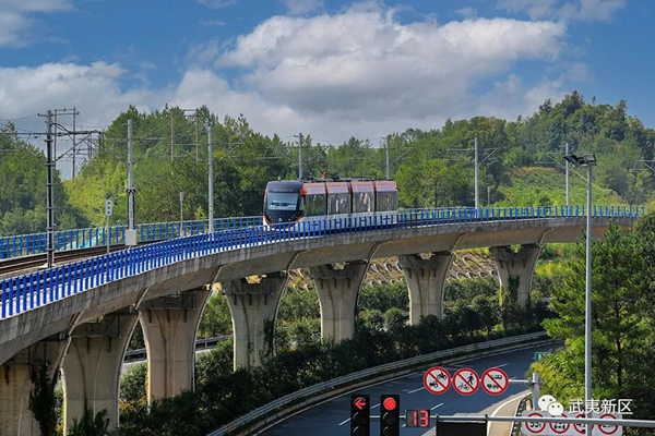 穿梭于綠水青山之間的輕軌列車