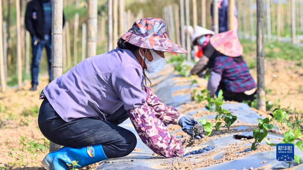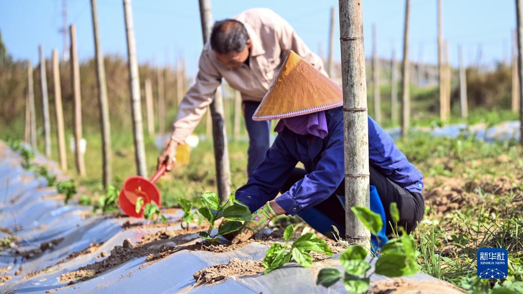 在欽州市三娘灣黃金百香果種植園,農(nóng)民在種植黃金百香果苗(12月14日攝)。 近日,廣西欽州市農(nóng)民利用冬季光溫資源豐富優(yōu)勢(shì),發(fā)展冬種產(chǎn)業(yè)。 新華社記者 張愛林 攝