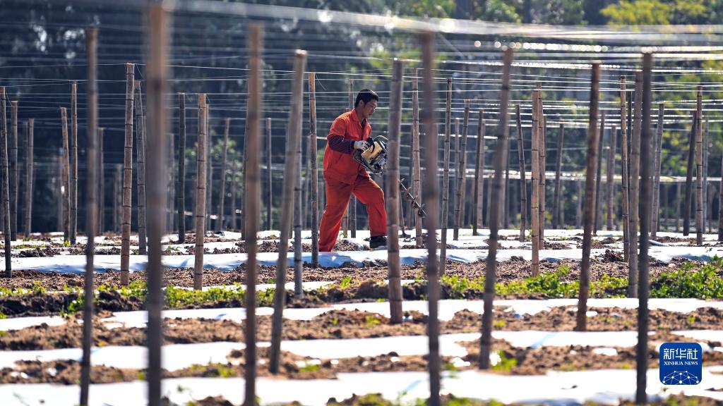 在欽州市三娘灣黃金百香果種植園,一名農(nóng)民在搭建黃金百香果苗架(12月14日攝)。 近日,廣西欽州市農(nóng)民利用冬季光溫資源豐富優(yōu)勢(shì),發(fā)展冬種產(chǎn)業(yè)。 新華社記者 張愛林 攝