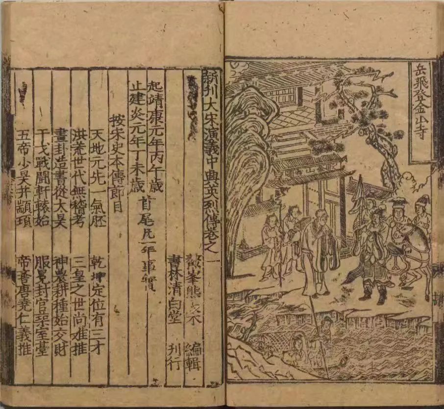 明代嘉靖楊氏清白堂清江堂刊本《大宋中興英烈傳》書影 建陽書坊宋元明三代刊刻小說的歷史一脈相承。宋代建陽刊刻小說以重知識重學術的文言小說為主,元代趨向通俗,但大量講史平話的刊刻則可見宋代文教傳統之延續,只是教育文化更為普及和下移。明代延續宋元以來以普及教化的傳統,而表現出更為明確的面向庶民閱讀的編刊定位:小說語體仍以通俗白話為主,而少文言小說。文體上以普及歷史知識的講史小說最為大宗,在元代講史平話的基礎上,接受了《資治通鑒綱目》等著作的觀念和知識,以“按鑒”相標榜;受講史小說知識性影響,公案小說以普及司法知識為主旨,就連神魔小說也多為“以志怪法演史”。小說版式上延續宋元經史普及讀物插圖本的影響,以上圖下文為主,以圖釋文,這種版式跟小說的隨文注釋評點相結合,最為凸顯小說編刊引導文化水平不高的“庸夫愚婦”閱讀的用心。
