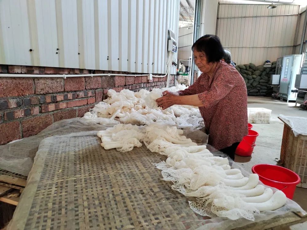 6月,建陽(yáng)區(qū)崇泰街道彭墩村興農(nóng)農(nóng)機(jī)專業(yè)合作社的長(zhǎng)裙竹蓀迎來(lái)了采摘旺季。 走進(jìn)竹蓀的種植棚內(nèi),大棚里滿地的竹蓀蛋爭(zhēng)相萌發(fā),長(zhǎng)勢(shì)十分喜人。一朵朵竹蓀舒展自己潔白的裙擺,種植大棚內(nèi)清香彌漫,務(wù)工的村民們?cè)诖笈锢锊烧⒎謷⒀b筐,討論著這批竹蓀的長(zhǎng)勢(shì)和產(chǎn)量,雖然忙碌,卻也掩飾不住內(nèi)心的喜悅。 每天的早晨6時(shí)至10時(shí)是竹蓀采摘的“黃金時(shí)間”。隨著溫度的升高,竹蓀生長(zhǎng)速度開(kāi)始加快,散裙后的竹蓀如披著一層薄薄的網(wǎng)狀白紗,極不易采摘。“我們每天來(lái)這里采竹蓀,收入還是很不錯(cuò)的,一個(gè)早上能賺60塊錢呢。”村民劉天素說(shuō)道。像劉天素這樣的村民還有10余位,采摘竹蓀為他們?nèi)司鍪樟?000余元,在家門口盡享就業(yè)的幸福。