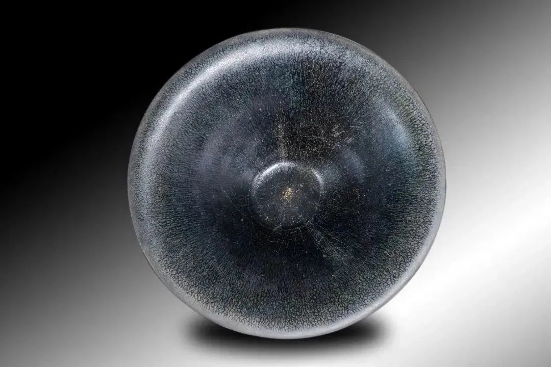 銀兔毫撇口盞 口徑18.3 高8.4 底5.3 釉面銀毫紋清晰細(xì)膩 器型端正 胎底鐵質(zhì)感強(qiáng) 屬上乘之作