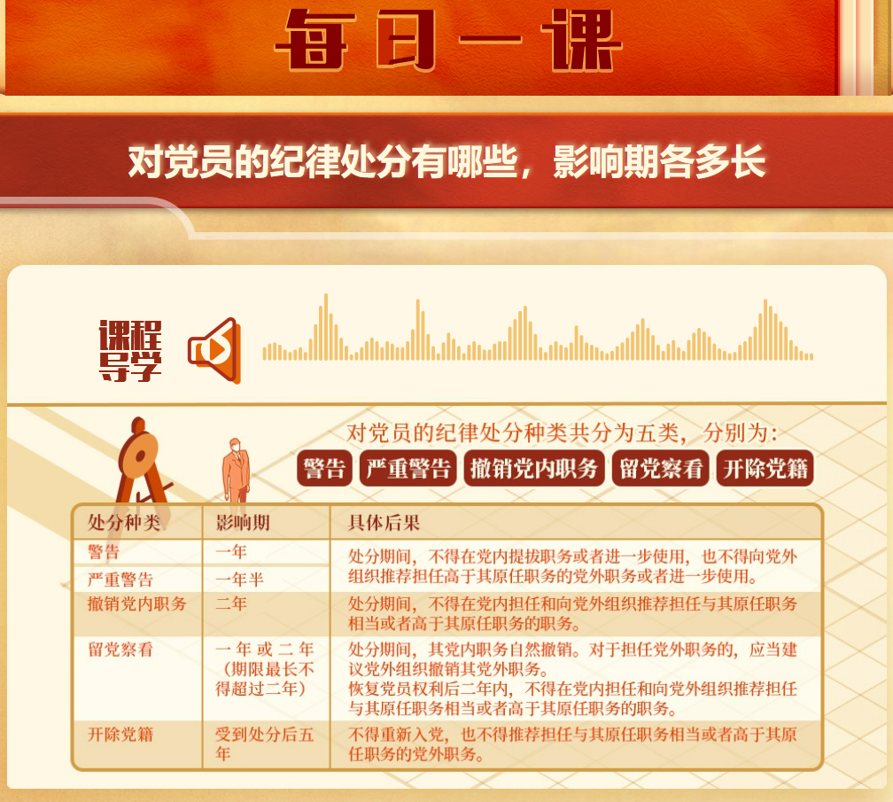《中國(guó)共產(chǎn)黨紀(jì)律處分條例》規(guī)定,對(duì)黨員的紀(jì)律處分種類(lèi)共分為五類(lèi),分別為警告、嚴(yán)重警告、撤銷(xiāo)黨內(nèi)職務(wù)、留黨察看和開(kāi)除黨籍。 警告是黨組織對(duì)違紀(jì)黨員提出的告誡,以促使其認(rèn)識(shí)和改正錯(cuò)誤。警告是最輕的一種黨紀(jì)處分,適用于違紀(jì)情節(jié)較輕、但必須給予黨紀(jì)處分的黨員。 嚴(yán)重警告是一種重于警告的較輕黨紀(jì)處分,適用于違紀(jì)性質(zhì)和情節(jié)比較重的黨員。 撤銷(xiāo)黨內(nèi)職務(wù)屬于較重的黨紀(jì)處分,適用于那些所犯錯(cuò)誤性質(zhì)、情節(jié)嚴(yán)重,不宜再擔(dān)任現(xiàn)任全部黨內(nèi)職務(wù)或某一個(gè)或幾個(gè)黨內(nèi)職務(wù)的違紀(jì)黨員。 留黨察看是僅次于開(kāi)除黨籍的一種較重的黨紀(jì)處分,適用于嚴(yán)重違紀(jì)、但尚未喪失共產(chǎn)黨員條件,不宜再擔(dān)任現(xiàn)任全部黨內(nèi)職務(wù)的黨員。 開(kāi)除黨籍是最重的黨紀(jì)處分,適用于嚴(yán)重違紀(jì)、已喪失共產(chǎn)黨員條件的黨員。 警告和嚴(yán)重警告處分影響和后果—— 黨員受到警告處分一年內(nèi)、受到嚴(yán)重警告處分一年半內(nèi),不得在黨內(nèi)提拔職務(wù)或者進(jìn)一步使用,也不得向黨外組織推薦擔(dān)任高于其原任職務(wù)的黨外職務(wù)或者進(jìn)一步使用。其中,關(guān)于“一年內(nèi)”“一年半內(nèi)”的起算時(shí)間,是從警告或者嚴(yán)重警告處分批準(zhǔn)之日起計(jì)算。 撤銷(xiāo)黨內(nèi)職務(wù)處分影響和后果—— 撤銷(xiāo)黨內(nèi)職務(wù)處分,是指撤銷(xiāo)受處分黨員由黨內(nèi)選舉或者組織任命的黨內(nèi)職務(wù)。對(duì)于在黨內(nèi)擔(dān)任兩個(gè)以上職務(wù)的,黨組織在作處分決定時(shí),應(yīng)當(dāng)明確是撤銷(xiāo)其一切職務(wù)還是一個(gè)或者幾個(gè)職務(wù)。如果決定撤銷(xiāo)其一個(gè)職務(wù),必須撤銷(xiāo)其擔(dān)任的最高職務(wù)。如果決定撤銷(xiāo)其兩個(gè)以上職務(wù),則必須從其擔(dān)任的最高職務(wù)開(kāi)始依次撤銷(xiāo)。對(duì)于在黨外組織擔(dān)任職務(wù)的,應(yīng)當(dāng)建議黨外組織撤銷(xiāo)其黨外職務(wù)。 對(duì)于在立案審查中因涉嫌違犯黨紀(jì)被免職的黨員,審查后依照本條例規(guī)定應(yīng)當(dāng)給予撤銷(xiāo)黨內(nèi)職務(wù)處分的,應(yīng)當(dāng)按照其原任職務(wù)給予撤銷(xiāo)黨內(nèi)職務(wù)處分。對(duì)于應(yīng)當(dāng)受到撤銷(xiāo)黨內(nèi)職務(wù)處分,但是本人沒(méi)有擔(dān)任黨內(nèi)職務(wù)的,應(yīng)當(dāng)給予其嚴(yán)重警告處分。同時(shí),在黨外組織擔(dān)任職務(wù)的,應(yīng)當(dāng)建議黨外組織撤銷(xiāo)其黨外職務(wù)。 黨員受到撤銷(xiāo)黨內(nèi)職務(wù)處分,或者依照前款規(guī)定受到嚴(yán)重警告處分的,二年內(nèi)不得在黨內(nèi)擔(dān)任和向黨外組織推薦擔(dān)任與其原任職務(wù)相當(dāng)或者高于其原任職務(wù)的職務(wù)。 留黨察看處分影響和后果—— 留黨察看處分,分為留黨察看一年、留黨察看二年。對(duì)于受到留黨察看處分一年的黨員,期滿(mǎn)后仍不符合恢復(fù)黨員權(quán)利條件的,應(yīng)當(dāng)延長(zhǎng)一年留黨察看期限。留黨察看期限最長(zhǎng)不得超過(guò)二年。 黨員受留黨察看處分期間,沒(méi)有表決權(quán)、選舉權(quán)和被選舉權(quán)。留黨察看期間,確有悔改表現(xiàn)的,期滿(mǎn)后恢復(fù)其黨員權(quán)利;堅(jiān)持不改或者又發(fā)現(xiàn)其他應(yīng)當(dāng)受到黨紀(jì)處分的違紀(jì)行為的,應(yīng)當(dāng)開(kāi)除黨籍。 黨員受到留黨察看處分,其黨內(nèi)職務(wù)自然撤銷(xiāo)。對(duì)于擔(dān)任黨外職務(wù)的,應(yīng)當(dāng)建議黨外組織撤銷(xiāo)其黨外職務(wù)。受到留黨察看處分的黨員,恢復(fù)黨員權(quán)利后二年內(nèi),不得在黨內(nèi)擔(dān)任和向黨外組織推薦擔(dān)任與其原任職務(wù)相當(dāng)或者高于其原任職務(wù)的職務(wù)。需注意,這里的“二年內(nèi)”,是指自黨組織批準(zhǔn)恢復(fù)受處分黨員的黨員權(quán)利之日起二年內(nèi),期間自留黨察看期限期滿(mǎn)之日起計(jì)算。 開(kāi)除黨籍處分影響和后果—— 黨員受到開(kāi)除黨籍處分,五年內(nèi)不得重新入黨,也不得推薦擔(dān)任與其原任職務(wù)相當(dāng)或者高于其原任職務(wù)的黨外職務(wù)。另有規(guī)定不準(zhǔn)重新入黨的,依照規(guī)定。 |