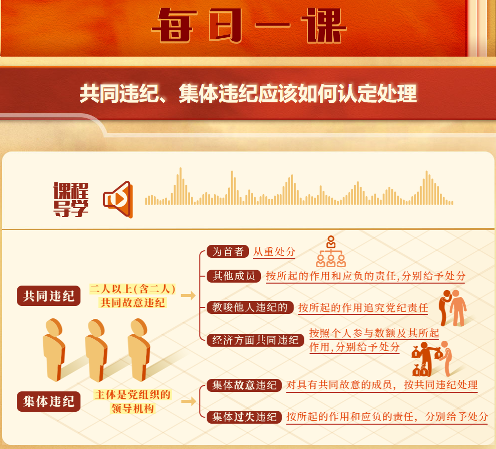《中國共產黨紀律處分條例》規定,共同違紀主要是指二人以上(含二人)共同故意違紀。 為首者,主要是指在共同違紀中起主要作用的黨員。除非《條例》另有規定,對為首者,從重處分。 對其他成員,按照其在共同違紀中所起的作用和應負的責任,分別給予處分。 教唆,主要是指以授意、慫恿、勸說、利誘或者其他方法故意唆使他人違紀,行為人必須具有教唆他人實施違紀的故意。教唆他人違紀的,按照其在共同違紀中所起的作用追究黨紀責任。 值得注意的是,新修訂的《條例》將經濟方面共同違紀的,由按照“個人所得數額”調整為按照“個人參與數額”及其所起作用,分別給予處分。還規定對共同違紀的為首者,情節嚴重的,按照共同違紀的總數額處分。這一數額認定規則,與刑法規定的共同犯罪中各行為人犯罪數額通常以行為人實際參與數額計算的做法,實現了貫通。 與共同違紀不同,集體違紀的主體是黨組織的領導機構。集體違紀包括集體故意違紀和集體過失違紀兩種情況。黨組織領導機構集體作出違犯黨紀的決定或者實施其他違犯黨紀的行為,對具有共同故意的成員,按共同違紀處理;對過失違紀的成員,按照各自在集體違紀中所起的作用和應負的責任分別給予處分。 需要留意不能以“集體領導”“集體負責”“集體研究”等為借口,不追究集體作出違紀決定或者集體實施違紀行為的領導成員責任。但是,以下兩種情形不屬于集體違紀:一是個人違反民主集中制的原則,擅自作出錯誤決定,不能追究集體責任,只能按照個人違紀處理。二是對于在領導機構作出錯誤決定或者實施錯誤行為時,沒有參與或者表示反對的,不視為集體違紀人員。 |