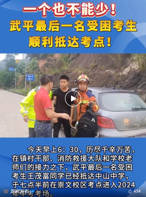 15日至16日,中考臨近,武平縣遭受歷史極值量級的暴雨襲擊,多地出現災情,給全縣中考帶來嚴峻考驗。武平縣迅速統籌組織應急管理、消防救援、電力、通信、交通等救援力量,爭分奪秒搶通道路,全力以赴恢復通信、通電。