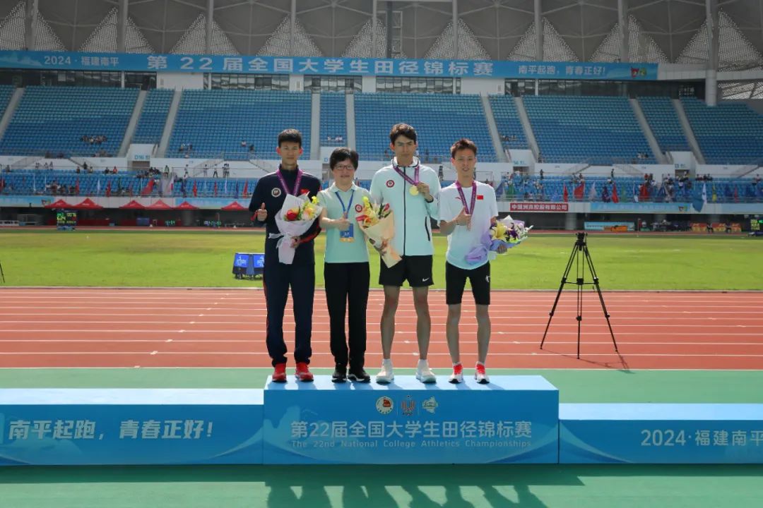 貴州大學領隊、教練與“大田賽”首金選手朱小強(中)在頒獎后合影留念