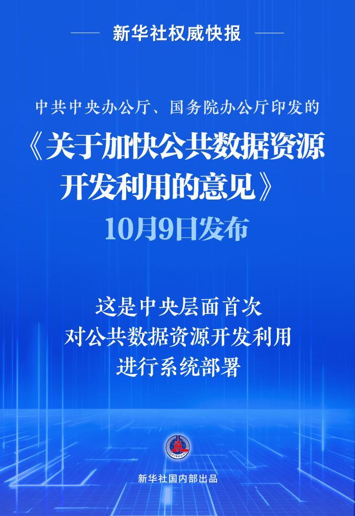 中共中央辦公廳、國務院辦公廳印發的《關于加快公共數據資源開發利用的意見》10月9日發布,這是中央層面首次對公共數據資源開發利用進行系統部署。 意見提出,到2025年,公共數據資源開發利用制度規則初步建立,資源供給規模和質量明顯提升,數據產品和服務不斷豐富,重點行業、地區公共數據資源開發利用取得明顯成效,培育一批數據要素型企業,公共數據資源要素作用初步顯現。 意見提出,到2030年,公共數據資源開發利用制度規則更加成熟,資源開發利用體系全面建成,數據流通使用合規高效,公共數據在賦能實體經濟、擴大消費需求、拓展投資空間、提升治理能力中的要素作用充分發揮。 意見圍繞深化數據要素配置改革,擴大公共數據資源供給;加強資源管理,規范公共數據授權運營;鼓勵應用創新,推動數據產業健康發展;統籌發展和安全,營造開發利用良好環境4個方面,部署加快推進公共數據資源開發利用工作。 |