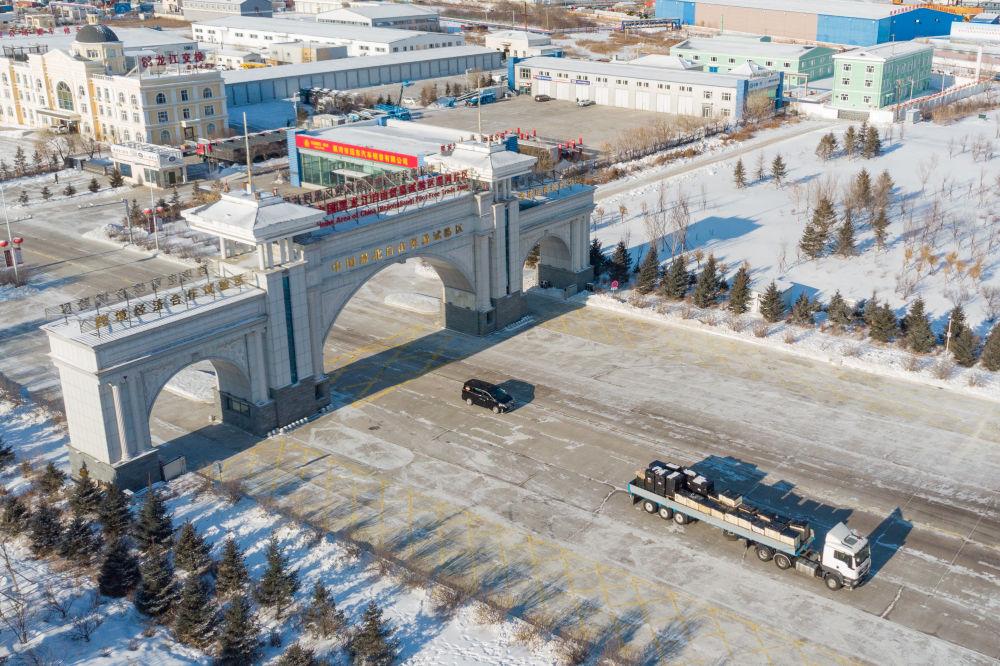 這是中國(黑龍江)自由貿易試驗區黑河片區(2024年1月31日攝,無人機照片)。 2023年,該自貿片區外貿進出口總值達244.82億元,實現增幅56.9%,引進外資企業16家,直接利用外資127.3萬美元,同比增長27.3%。