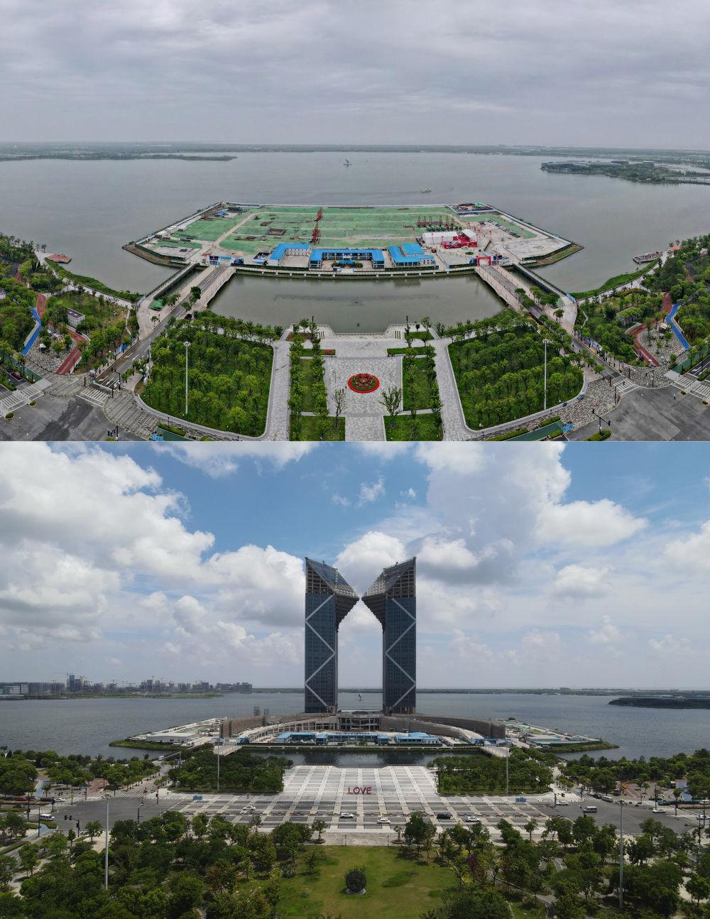 拼版照片:空中俯瞰中國(上海)自由貿易試驗區臨港新片區滴水湖西島中銀金融中心項目現場(上圖為2021年6月20日攝,無人機照片;下圖為2024年8月14日攝,無人機照片)。2019年8月20日,臨港新片區揭牌成立,一個開放新高地在長江與東海交匯處日益崛起。