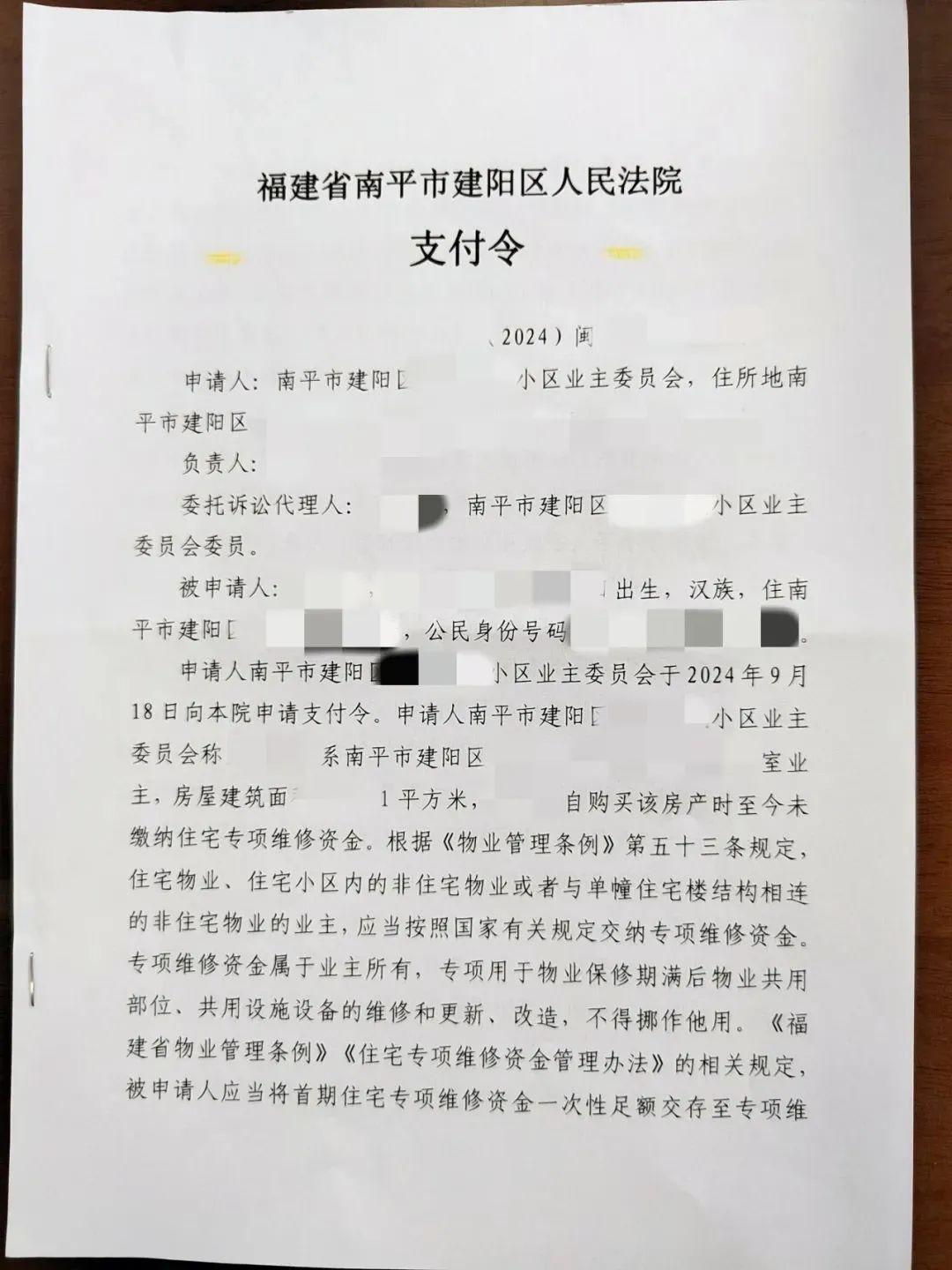 近日,建陽區城管部門強化與區人民法院的部門聯動,根據《福建省物業管理條例》的相關規定,針對在完成兩次催收及公告催交后仍不交納等情況,積極引導相關小區業主委員會作為申請人,依法向區人民法院申請支付令,督促小區欠交業主限期補交住宅專項維修資金。