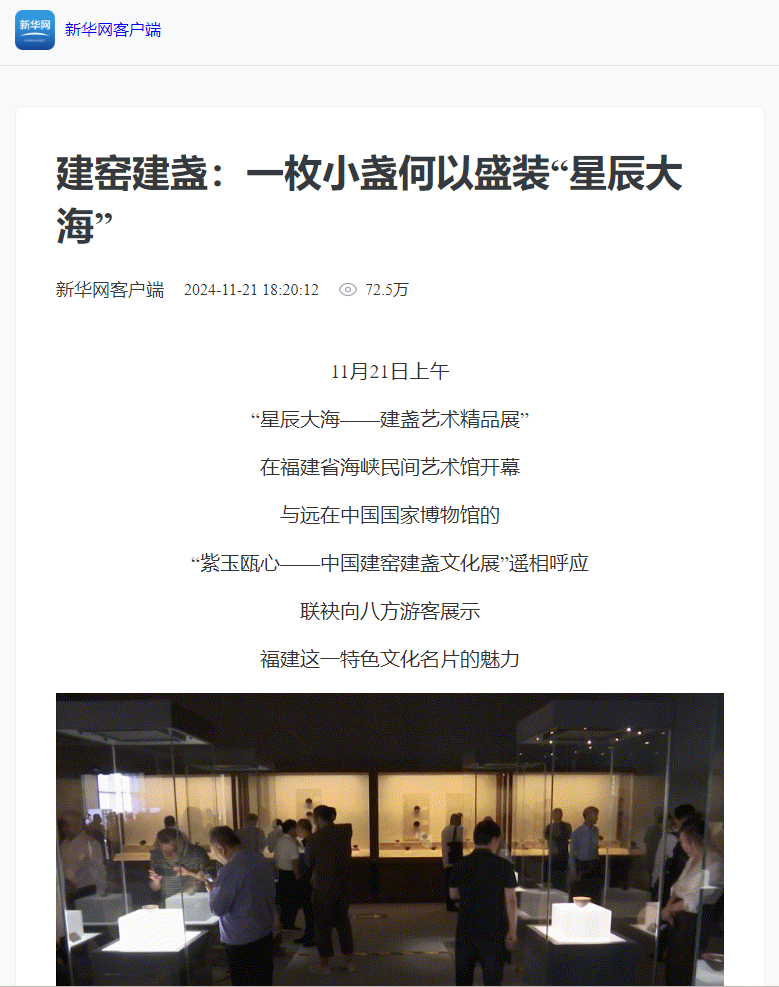 11月21日,新華網刊發《建窯建盞:一枚小盞何以盛裝“星辰大海”》 11月21日上午 “星辰大海——建盞藝術精品展” 在福建省海峽民間藝術館開幕 與遠在中國國家博物館的 “紫玉甌心——中國建窯建盞文化展”遙相呼應 聯袂向八方游客展示 福建這一特色文化名片的魅力