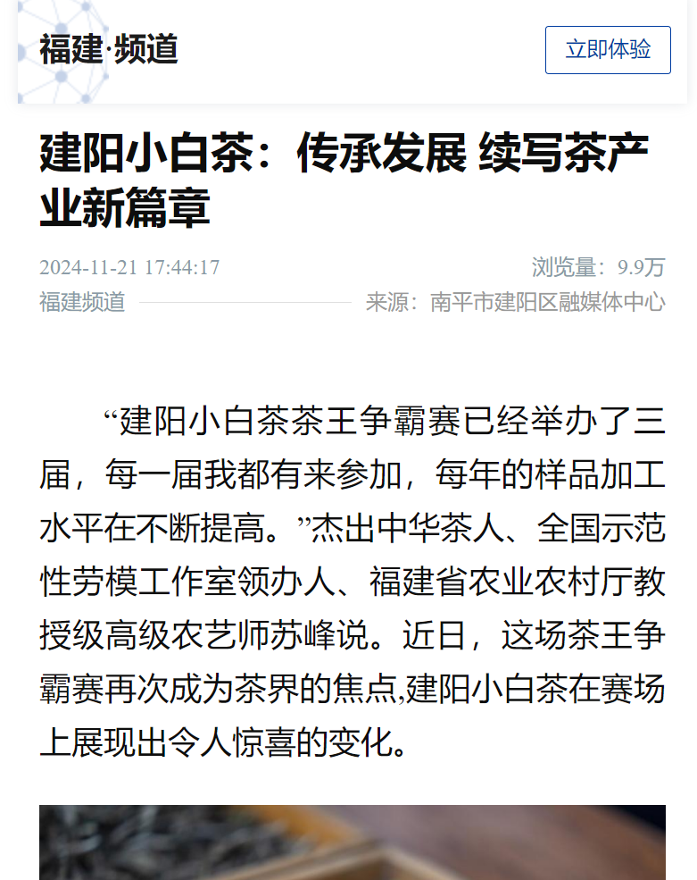 11月21日,新華社刊發《建陽小白茶:傳承發展 續寫茶產業新篇章》 “建陽小白茶茶王爭霸賽已經舉辦了三屆,每一屆我都有來參加,每年的樣品加工水平在不斷提高。”杰出中華茶人、全國示范性勞模工作室領辦人、福建省農業農村廳教授級高級農藝師蘇峰說。近日,這場茶王爭霸賽再次成為茶界的焦點,建陽小白茶在賽場上展現出令人驚喜的變化。