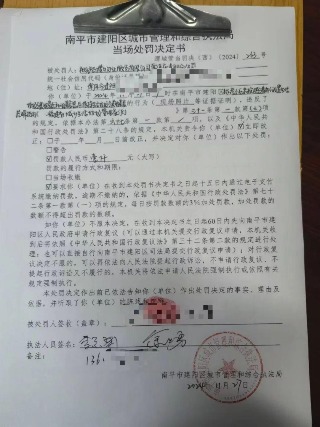 日前,建陽區城市管理和綜合執法局依據《福建省城鄉生活垃圾管理條例》,對九龍灣小區物業服務企業陽光智博物業服務有限公司南平市建陽分公司,未履行生活垃圾分類投放管理責任人工作責任,給予罰款人民幣1000元的行政處罰。
